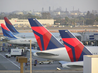 Delta had the same basic paint scheme for most of the 60's, 70's, and 80's. Then in the 90's, they went through two changes. Now, post-bankruptcy, they're changing again. I don't have any shots of the original scheme, and the first change is pretty rare these days. The shot above shows the two 90's schemes: Change one, in the background, which is fairly reminiscent of the original 'widget' design, and change two (flying flag) in front. The shot below illustrates the flying flag in the background, with the latest leaning widget design in front.