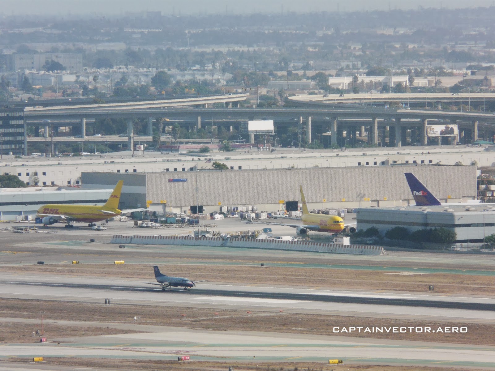 As you can probably tell from the freeway flyover ramps in the background (curiously devoid of traffic, as a couple of you pointed out), this is a view of the southeast corner of the airport, specifically the Imperial Cargo Complex, which we shorten to ICC (it's the government; we have to have an acronym or abbreviation). Although several of you noted it right off, a bit of inside knowledge might be required to realize that a FedEx tail isn't typically seen there. After all, FedEx has their own ramp just down the taxiway. The really sharp-eyed among you may even notice that it's not a normal FedEx tail.